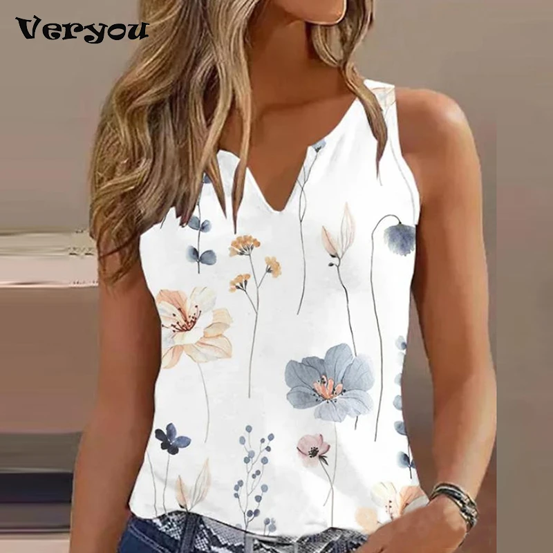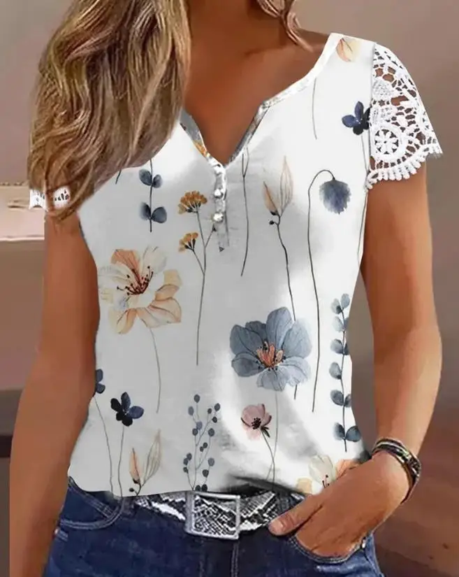 Woman T-Shirt 2023 Floral Print Notch Neck Lace