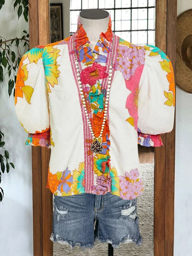 Women Elegant Floral Print Blouse Puff V Neck Shirt