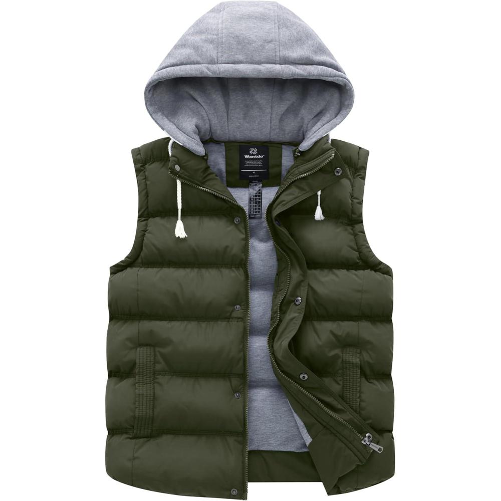 Wantdo Men’s Thicken Winter Vest Water-Resistant Puffer Jacket Thicken Vest with Removable Hood(Army Green)